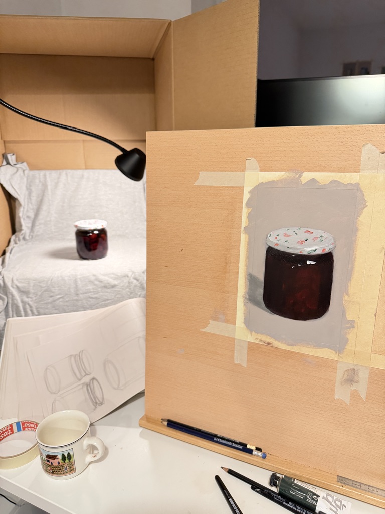 did 3 smol paintings this week only 1 worked. studing cyclinders, blending, color mixing all in one. this jam jar turned out to be cute. color mixing is hard. greens are hard. and it's not really straightforward to differentiate warm vs cold yellows once it's out of the tube, i keep labeling them. also for this jam, i kept mixing kadmium red and ultramarine blue with different configs like darken brighten add this and that, nothing worked for almost one straight hour. and then it was about alisarin crimson red and prussian blue. learning the hard way. also shadows needs to be worked they look pretty sloppy and wrong in value. but i like how it turned out.